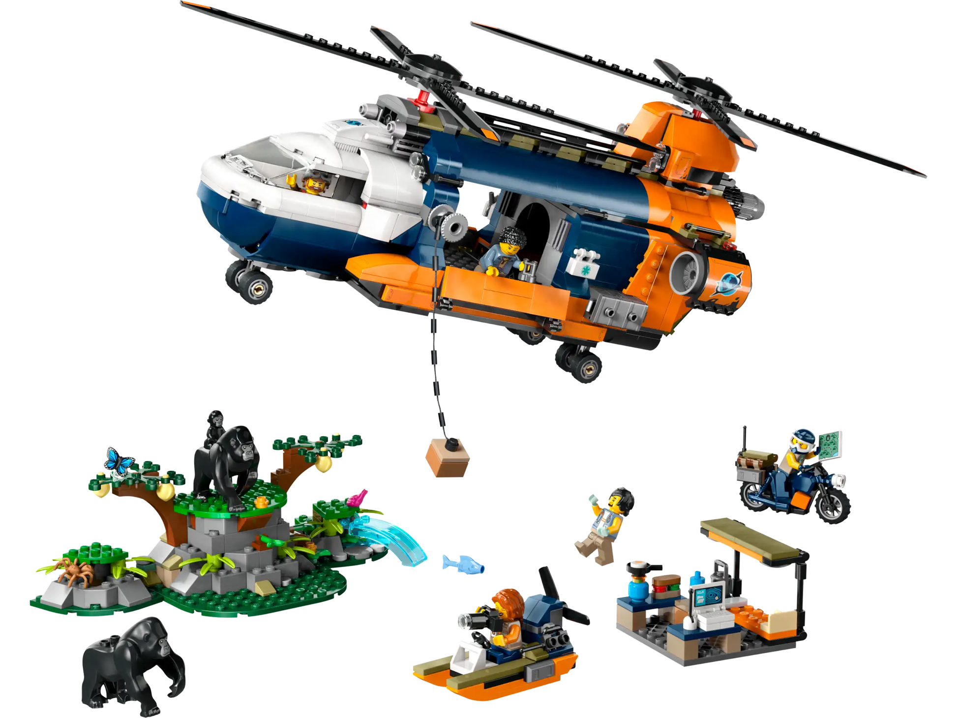 • Inhalt der Box: Dieses Abenteuerspielset beinhaltet einen Tandemhubschrauber, ein Motorrad, ein Sumpfboot, ein Dschungelbasislager, 5 Abenteuer-Minifiguren und 3 Spielzeug-Gorillas
