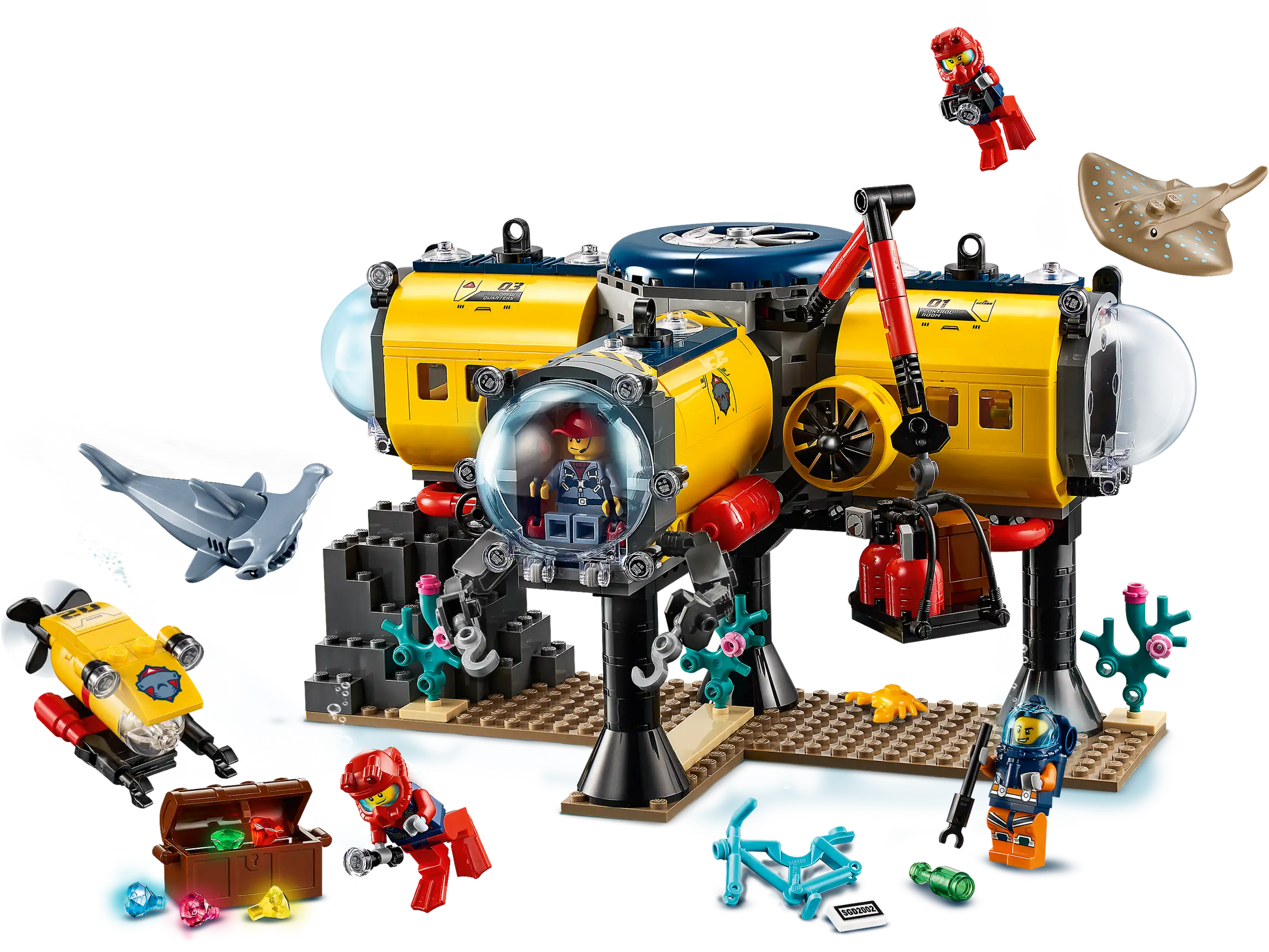 - In dem Set sind eine Spielzeug-Meeresforschungsbasis mit austauschbaren Wohn- und Forschungsmodulen, ein andockendes U-Boot, eine Unterwasserdrohne, fünf Meeresforscher-Minifiguren sowie ein Hai und ein Stachelrochen als zusätzliche Tierfiguren enthalten.