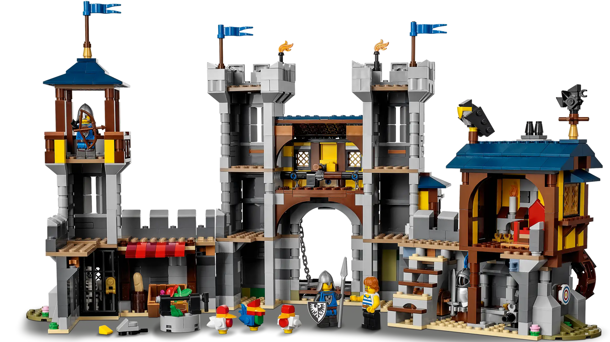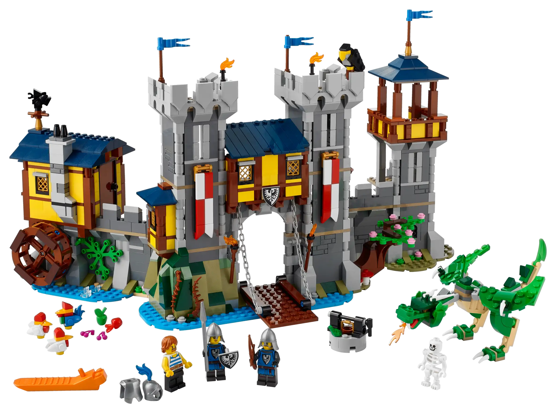 - Dieses Set ist ein wahrer Schatz für LEGO Fans und Mittelalter-Begeisterte: Das LEGO® Creator 3-in-1-Bauset „Mittelalterliche Burg“ vereint gleich drei faszinierende Modelle in einer Box. Ob Burg, Wachtturm oder mittelalterlicher Marktplatz – jedes Bauwerk steckt voller spannender Details und kreativer Möglichkeiten.