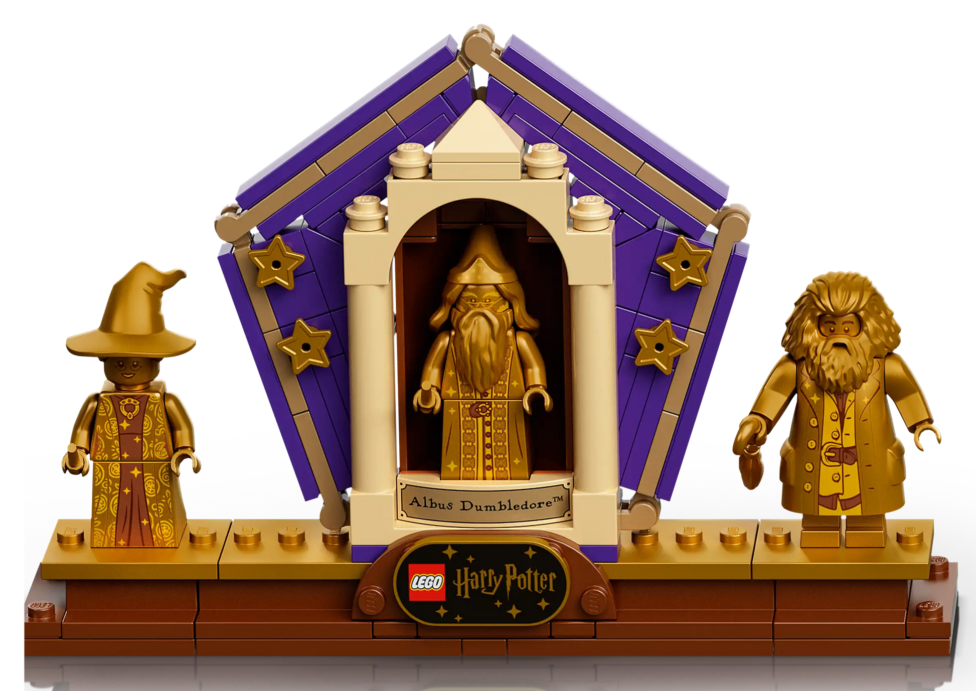 - Exklusive Minifiguren: Drei goldene Jubiläums-Minifiguren – Albus Dumbledore™, Minerva McGonagall™ und Rubeus Hagrid™ – feiern 20 Jahre LEGO® Harry Potter™ Magie. Ein speziell bedrucktes Jubiläumselement rundet das Sammlerset ab.
