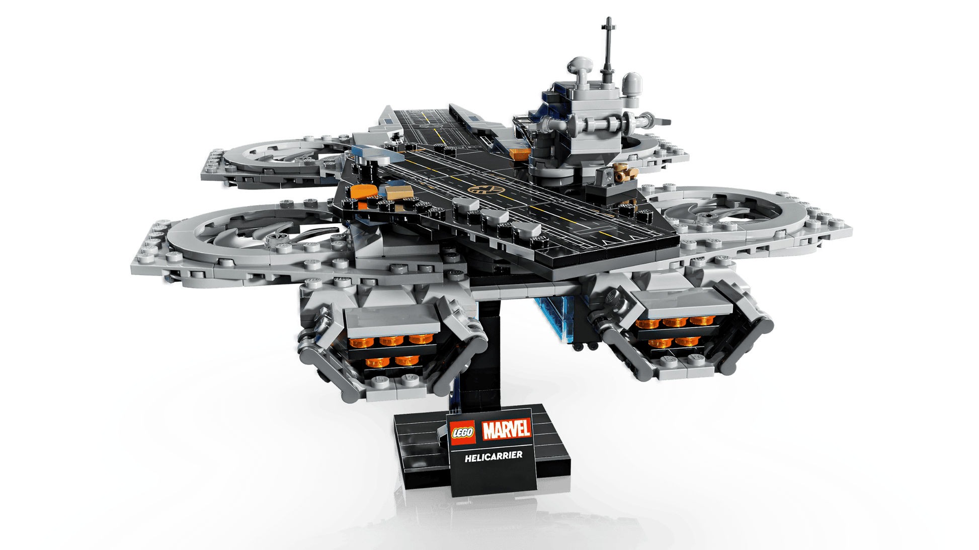 - Zeig, wofür du dich begeisterst: Der fliegende LEGO® Marvel Flugzeugträger steht auf einem robusten Sockel, der das Modell zu einem spektakulären Hingucker macht
