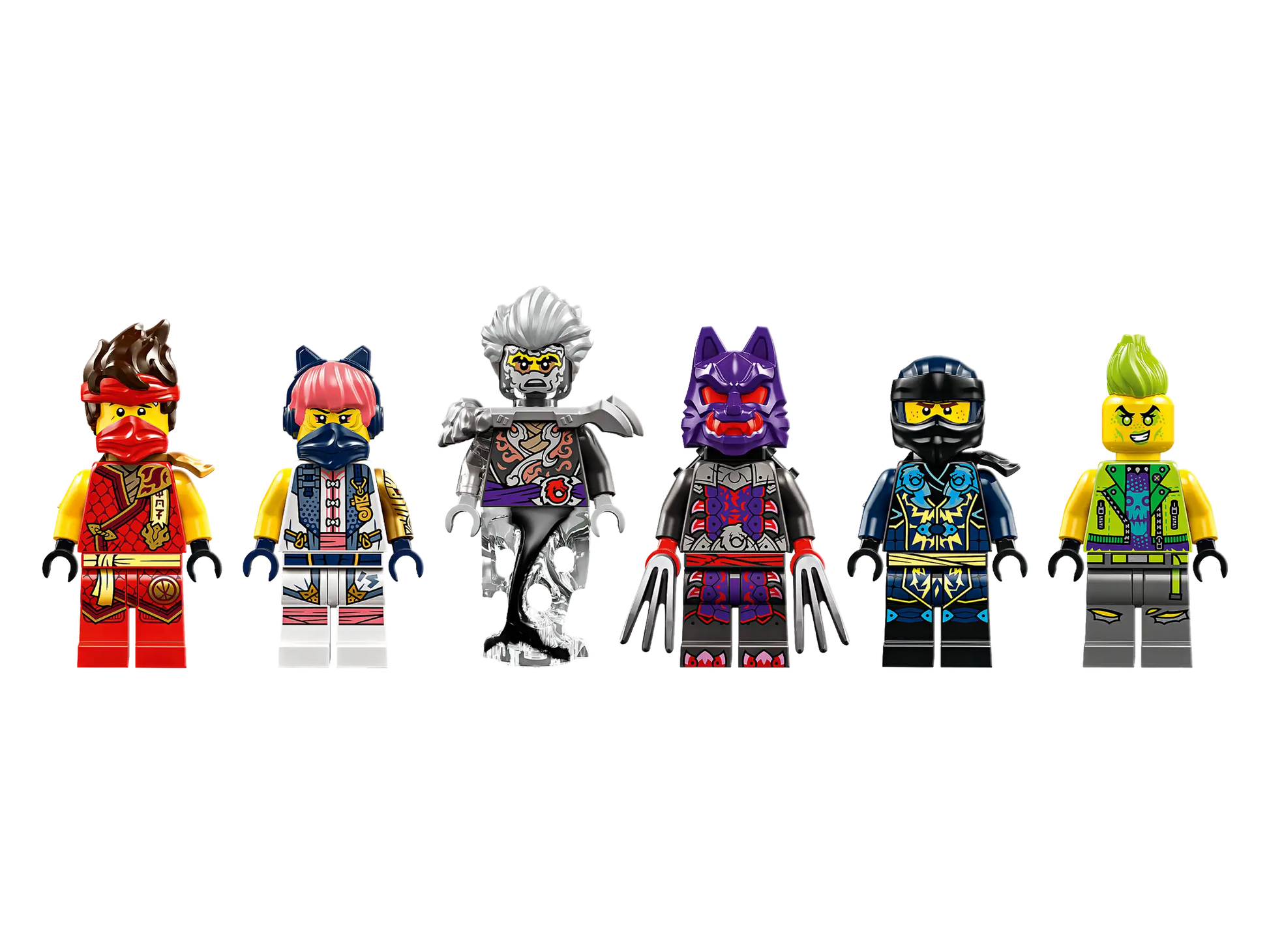 - Das Set enthält 6 Minifiguren: Kai und Sora in Turnierrüstung mit brandneuen Katanas sowie Cinder, einen Wolfsjäger und – exklusiv in diesem Set – den Bösen Jay und Tox.