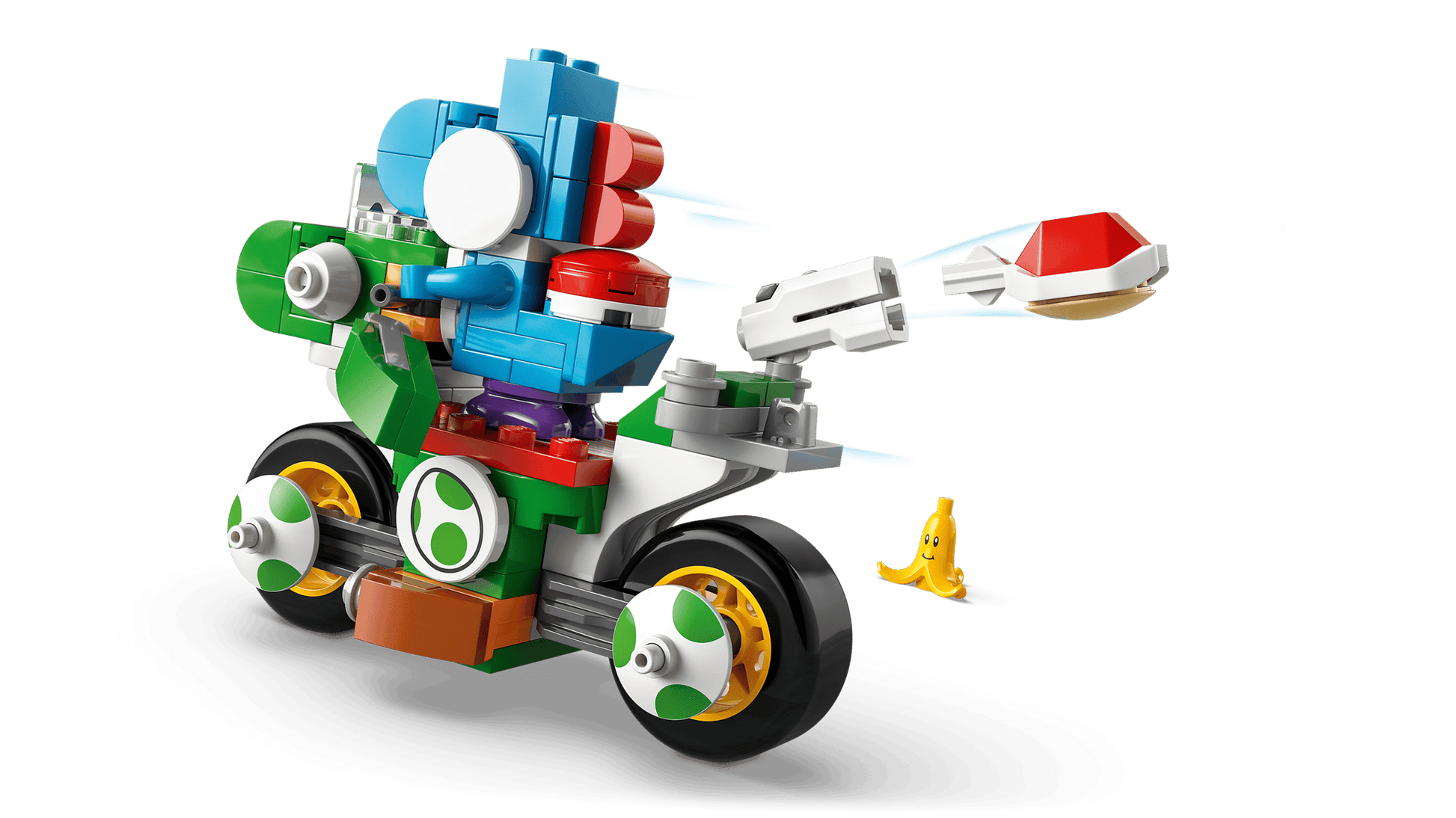 - Yoshi-Bike zum Spielen: Setz den hellblauen Yoshi auf das Yoshi-Bike und lenke es an den Verkehrshütchen vorbei, schleudere vom Spielzeug-Bike aus Panzer und mach einen Schlenker um die Banane